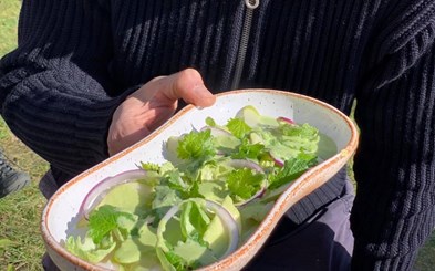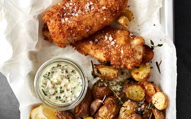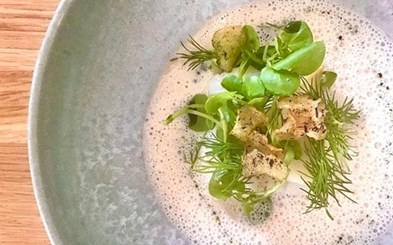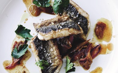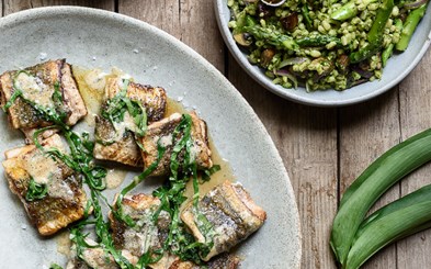 Stegt hornfisk med perlebyg, asparges og ramsløgspesto