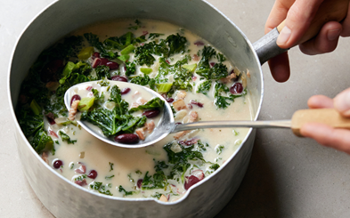 GRØNKÅLSSUPPE MED BACON, SENNEP OG RØDE BØNNER