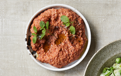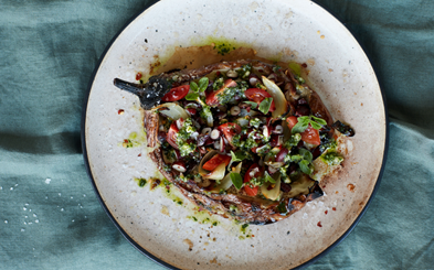 Ristede auberginer med bønne-tomatfyld, bagte løg, chili og basilikumpesto