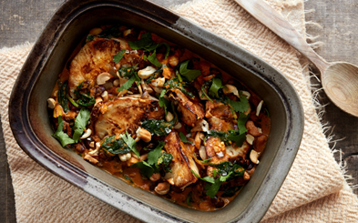 Bagt knoldselleri, kidneybønner og spinat i indisk tomat-cashewsauce