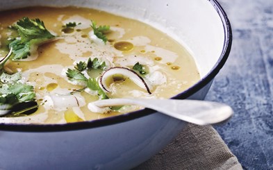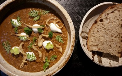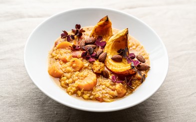 Dahl med grillet græskar, saltede mandler og skovsyre