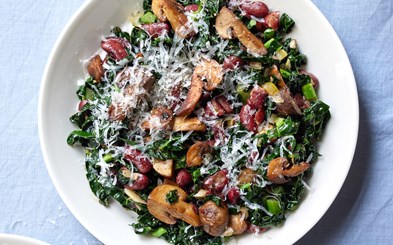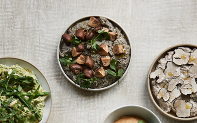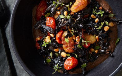 Gnocchi med sort bønnesauce, bagte tomater, timian og trompetsvampe