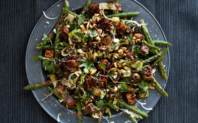 Stegt tofu med blegselleri, fermenterede bønner, chili, grønne bønner og jordnøddesauce