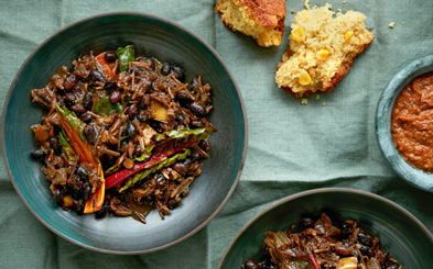 Hoppin' John med sorte bønner, vilde ris og black bean barbecuesauce
