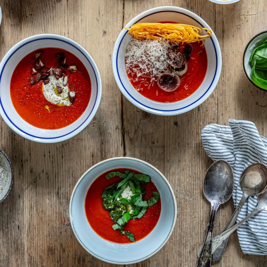 Her får du vores bud på tre velsmagende toppings til din suppe – i denne udgave serveret ovenpå en tomatsuppe, men de passer lige så godt til næsten enhver anden suppe.