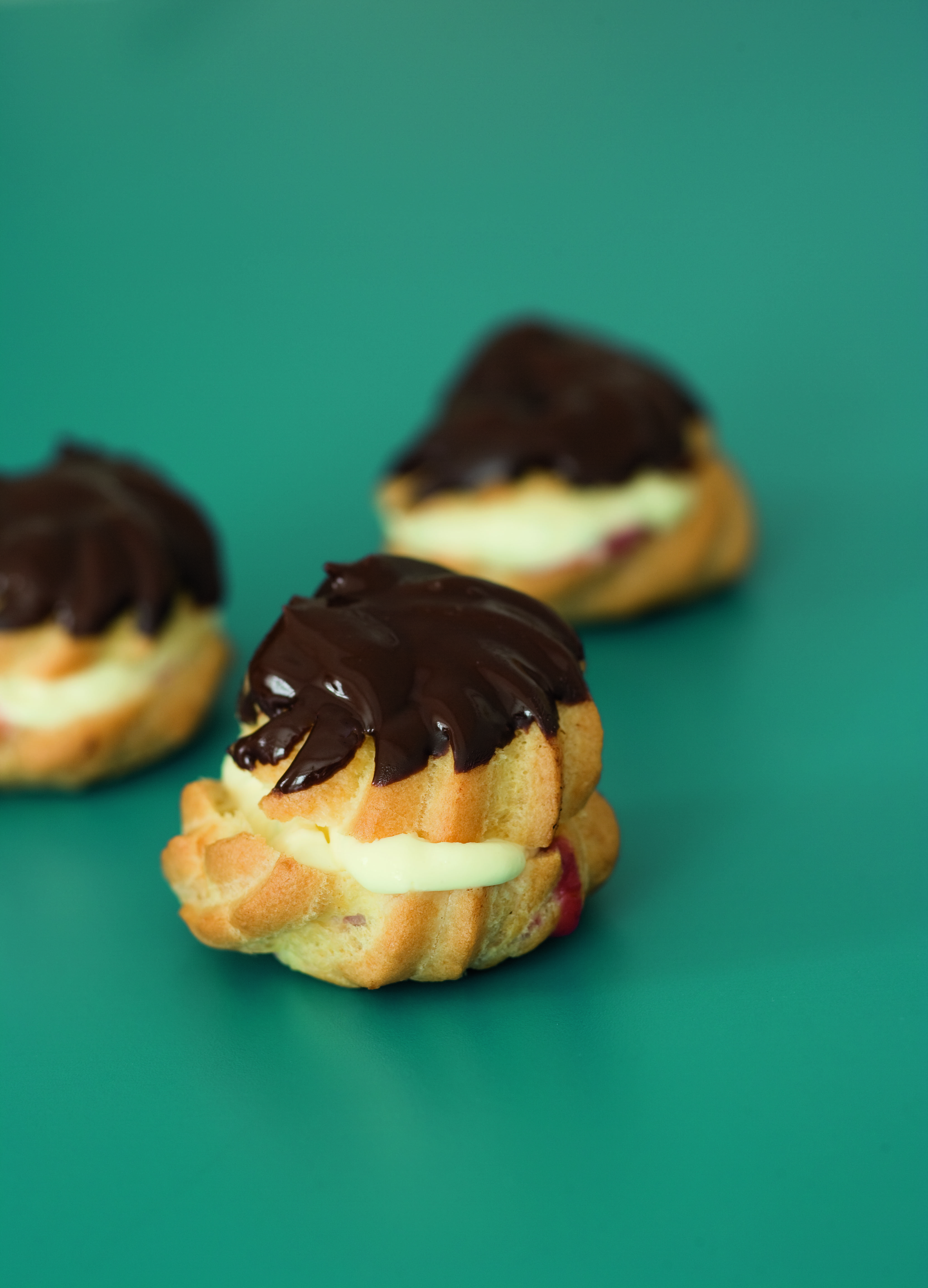 Smelt chokoladen i en skål over vandbad, og dyp toppen af vandbakkelserne i smeltet chokolade. Lad chokoladen størkne, og skær så vandbakkelsen over på midten. Læg en god klat hindbærmarmelade på hver bund, derpå 1-2 skefulde geraniumcreme, og afslut med at lægge toppene tilbage på vandbakkelserne. Spis vandbakkelserne indenfor de første 4 timer efter de er langt sammen.