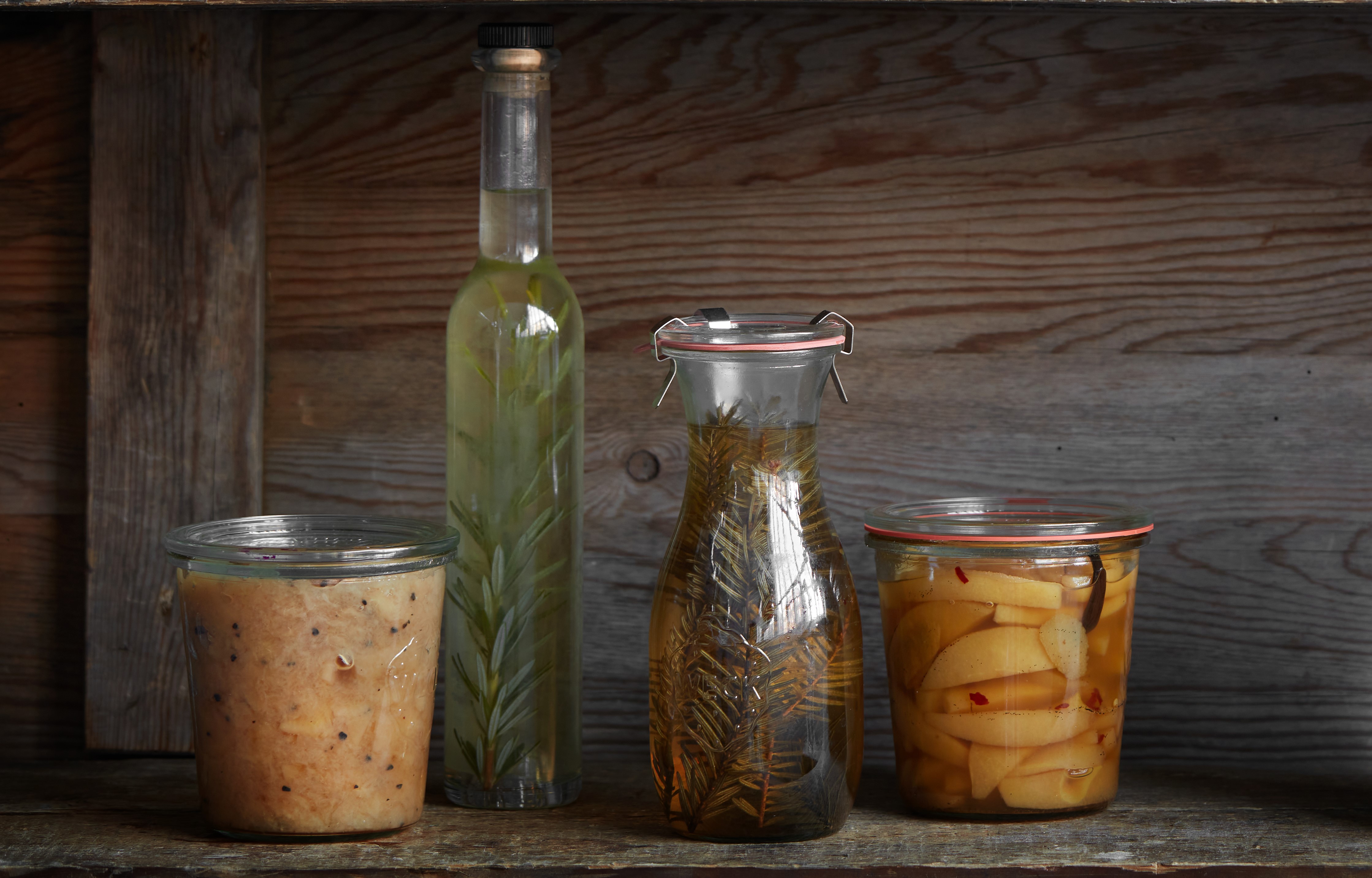 Kom kvæderne på skoldede glas. Kog lagen kort op, og hæld den over kvæderne. Luk glassene med det samme. De er klar, når de har trukket en uges tid i køleskabet, og kan holde sig i mindst tre måneder.
