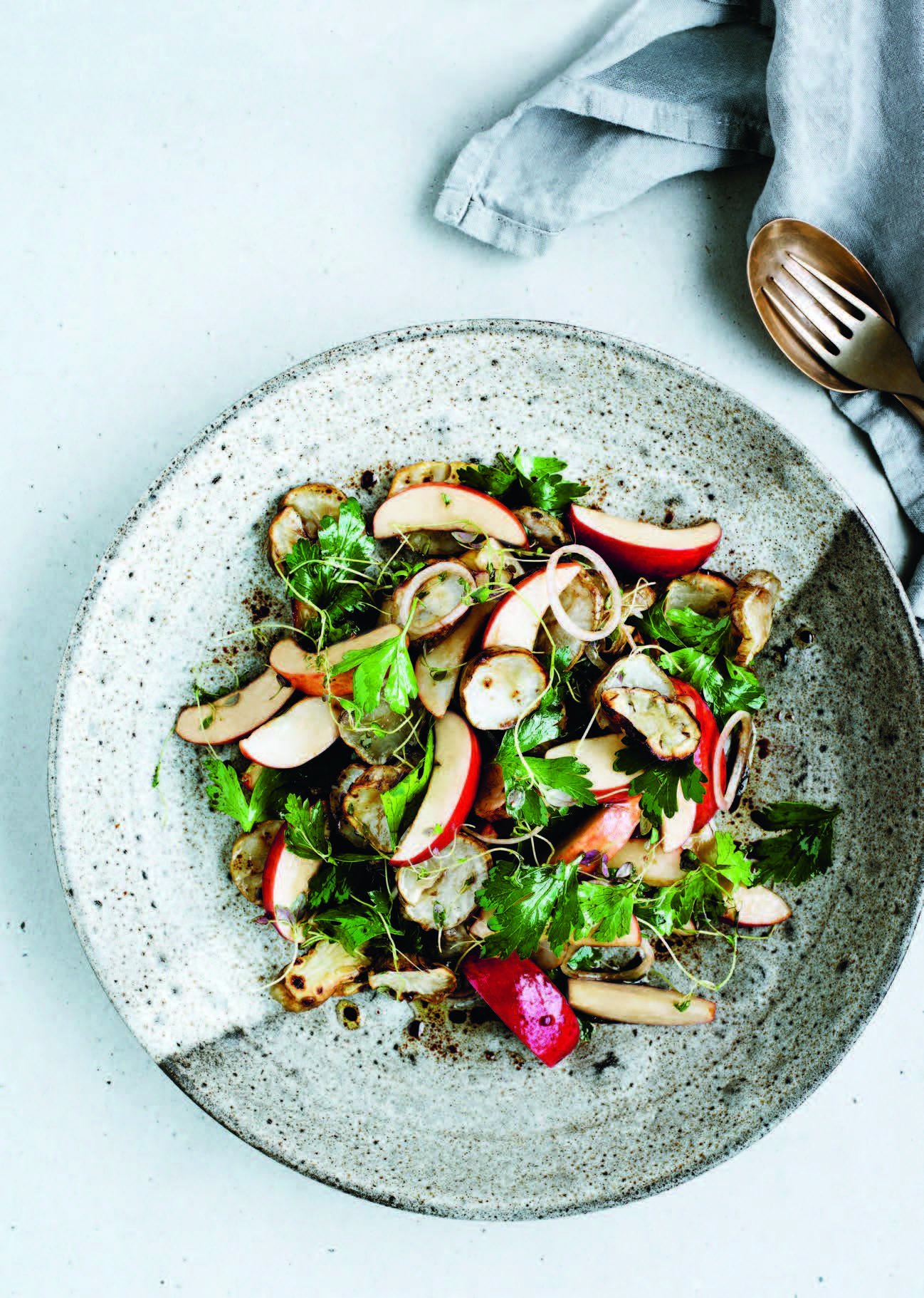 Hakkede, blandede svampe ristes med finthakket skalotteløg og hvidløg ved mellem varme til bløde og let gyldne. Tilsæt fond og evt. miso og lad det simre under låg i cirka 20 minutter. Smag til med salt, peber og en lille smule æblecidereddike. Æblet skæres i fine tern og vendes i lige før servering.