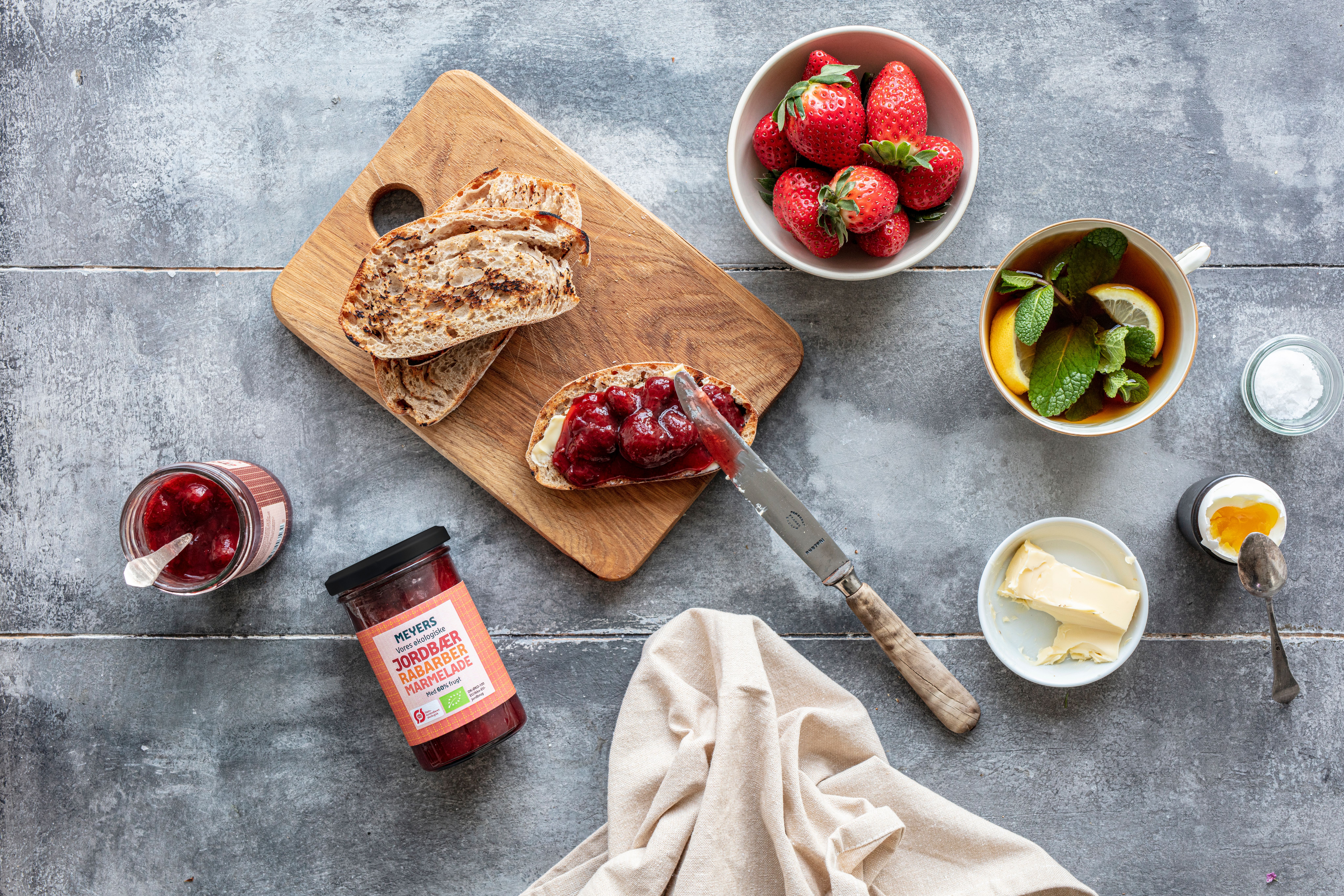Med 40% jordbær og 20% rabarber. Vores smagfulde jordbær-rabarbermarmelade har en skøn balance mellem sødme og syre. Marmeladen er oplagt at spise på det gode brød, i lagkager, på pandekager, i sommerens vaniljeis eller som tilbehør til vinterens æbleskiver.