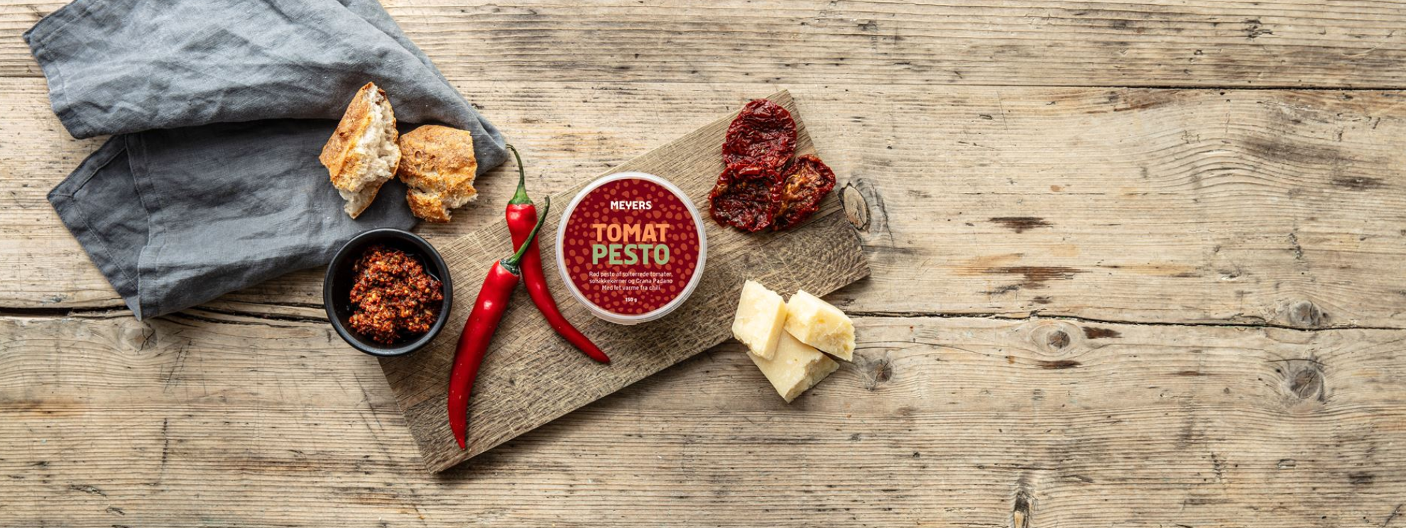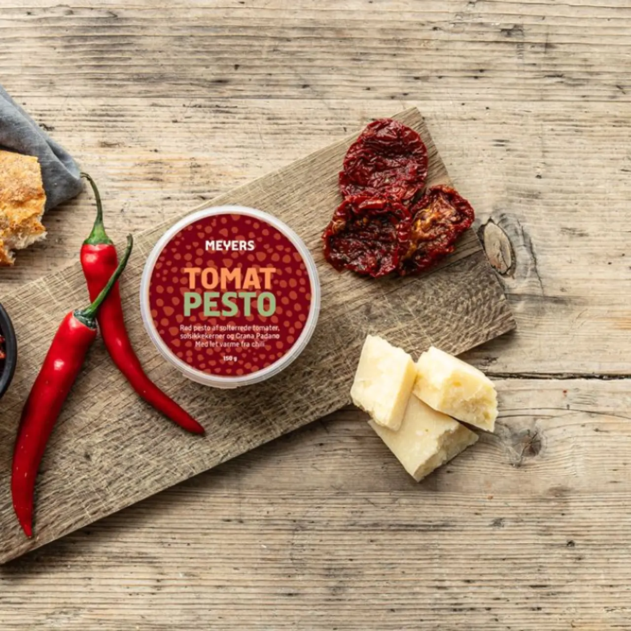 Vores Tomat & Chili Pesto har en intens tomatsmag og en stærk tomatprofil. Vi har skruet op for smagen af de soltørrede tomater, og pestoen har fået et spark chili, der giver en skøn varme, men samtidig ikke overdøver tomatens intensitet. Grana Padano-ost og solsikkekerner runder pestoen af og giver en cremet konsistens. Pestoen er en ideel følgesvend til brandvarm pasta, til bælgfrugter eller i din salat, på ristet brød eller som dip til sprøde eller bagte grøntsager. Få inspiration til, hvordan du kan bruge pestoen her.