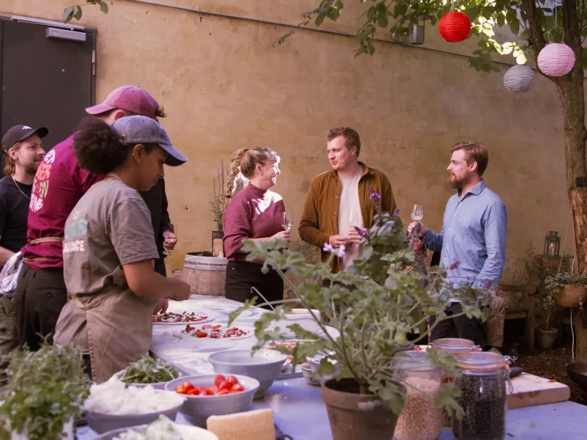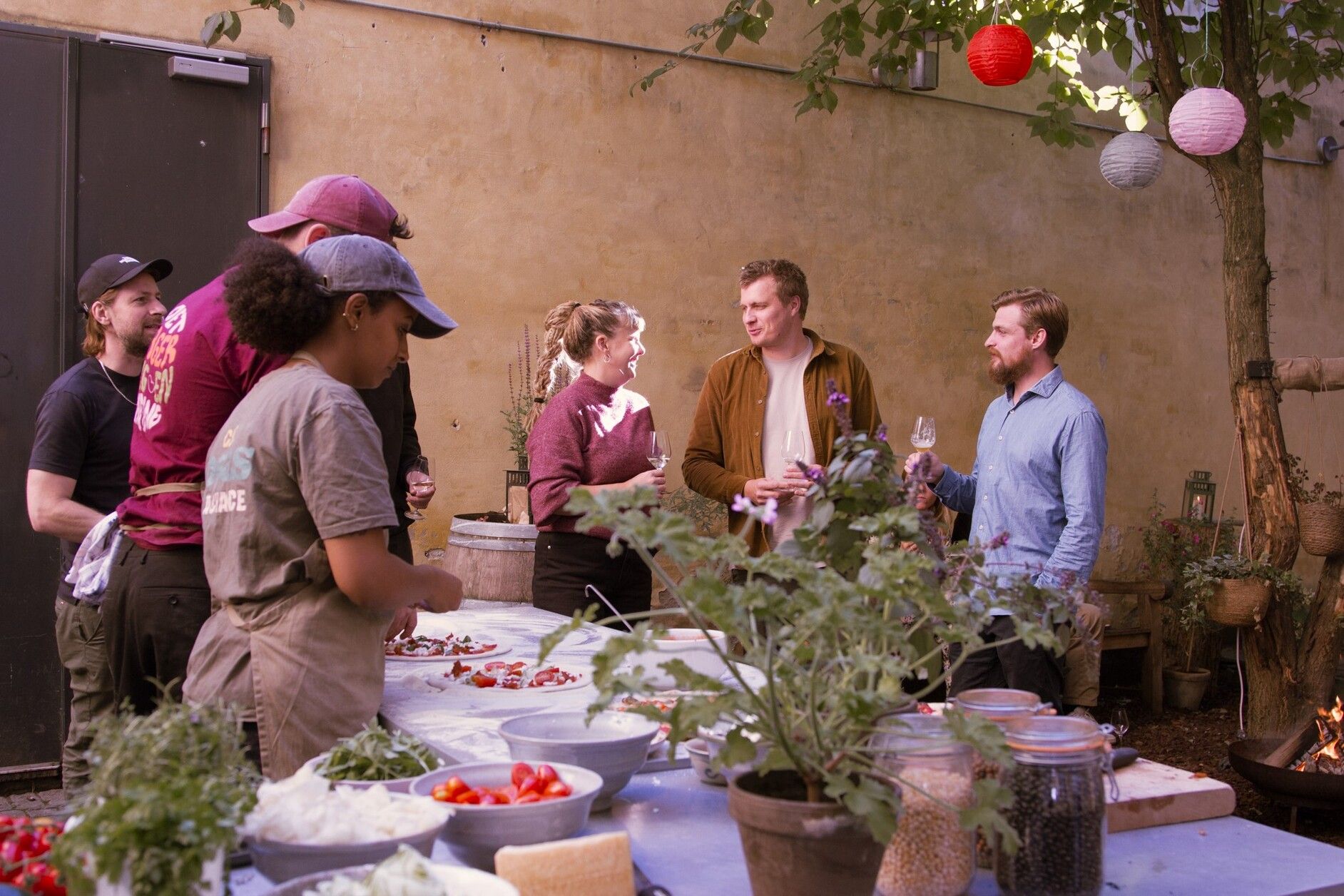 Kom ind i tredje baggård på Nørrebro og nyd sommerens summen under de kulørte lamper sammen med kollegerne. Vi har tændt op i bålfadene og har masser økologiske vin og øl på køl, og glæder os til at byde jer velkommen.